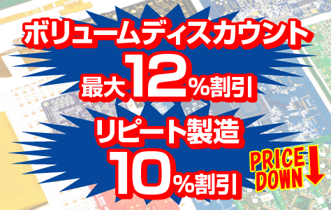 過去3ヶ月間のご購入金額(税抜)累計で、当月の割引率を算定する「ボリュームディスカウント」では最大12%割引いたします。また過去にご注文いただいた基板はリピート製造で10%割引にて何度でも製造いたします。