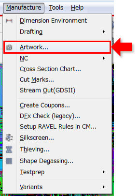 - メニューより、「Manufacture」 > 「Artwork」を選択し