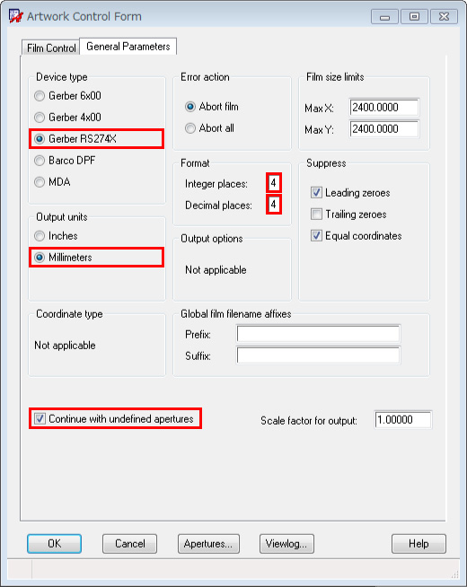 「General Parameters」タブからRS274xを選択し、各種設定を決定します。 - このフォームを表示した時に設定されている、Etch Class(配線クラス)の全てのSubclass(各配線層)が自動的にフォーム左側のAvalable Filmにリストされますので、それ以外の出力したいClass/Subclass(マスクやシルクなど)をAvalable Film内で定義します。また、各Filmの詳細設定についてはフォーム右のFilm Optionで設定します。