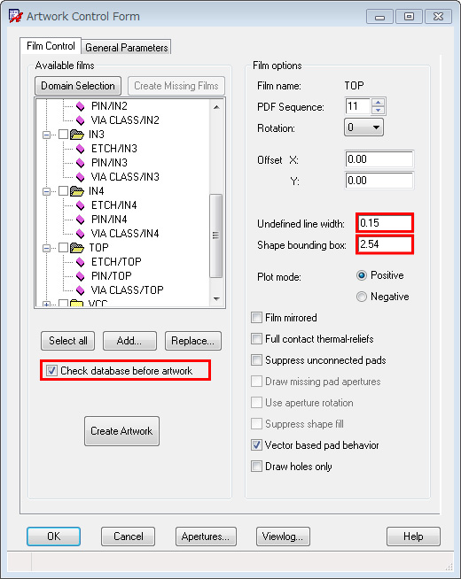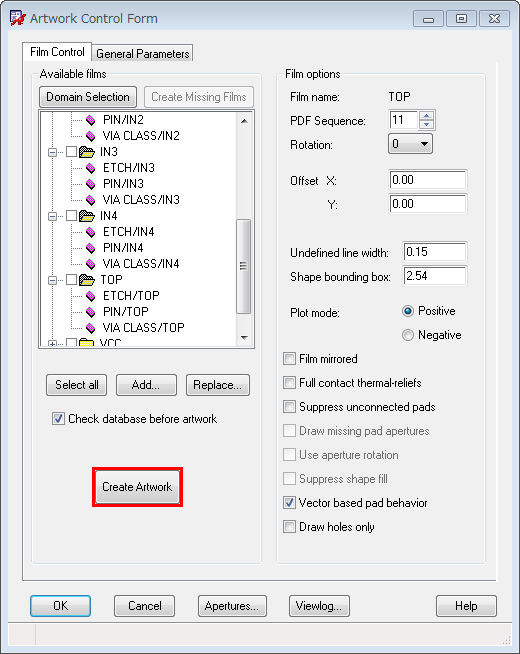 - ガーバー出力したいFilm名のチェックボックスにチェックをし、「Create Artworkボタン」をクリックすると