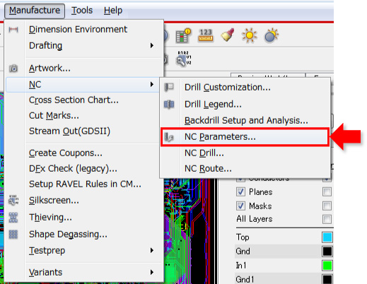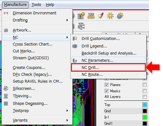メニューより、「Manufacture」 > 「NC」 > 「NC Drill」を選択してNC Drillフォームを表示します。 -