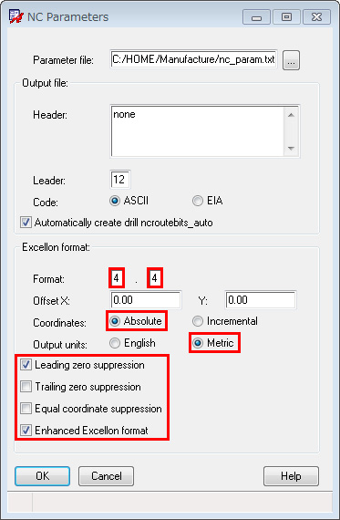 ドリルパラメータフォームが表示されますので各パラメータを設定します。 - このフォームは「Manufacture」 > 「NC」 > 「NC Drill」で起動する「NCDrillフォーム」