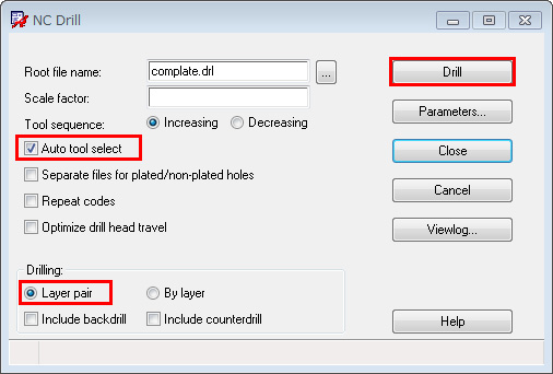 各種必要な設定を行い「Drillボタン」をクリックすると、起動ディレクトリにdrill-x-x.drlという名前のドリルファイルを出力します。