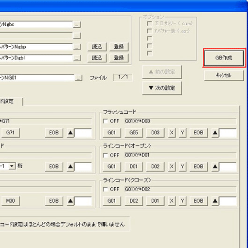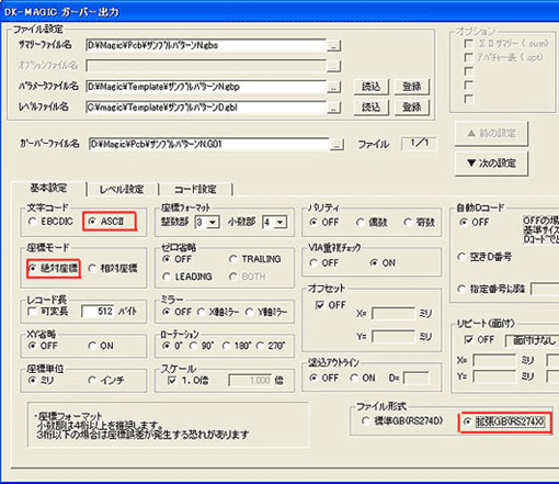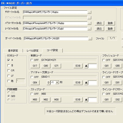 「ファイル 」→「GB作成」をクリックしてください。 - 下記の「DK Magic ガーバー出力」ウインドウが表示されます。