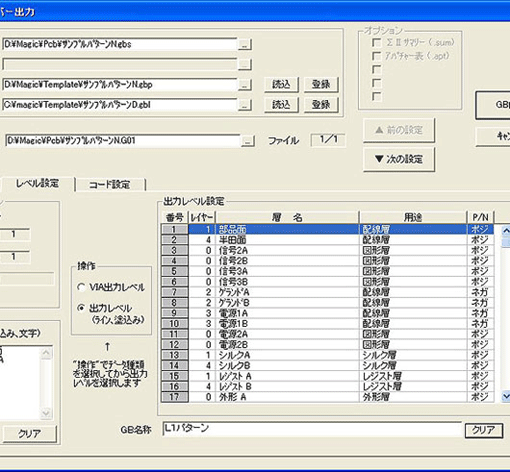 注:拡張ガーバーで出力するにはサーマルランドのアパチャーへ外径X、内径X、スリット幅の設定が必要です。設定は基準サイズ表で行います。 - 「レベル設定」タブで出力レベルを設定してください。MAGICではガーバー出力するランドとパターンを個別に選択します。1ファイル目の出力レベル設定が終了したら、「次の設定」ボタンをクリックして2ファイル目以降の出力レベルを順次設定してください。
