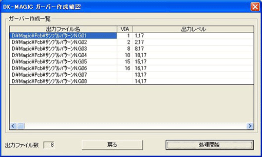 - 「GB作成」ボタンをクリックすると、下記「DK-Magicガーバー作成確認」のウインドウが表示されますので、出力ファイルを確認後、「処理開始」ボタンをクリックすると実行されます。