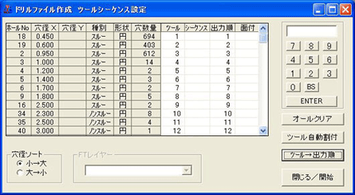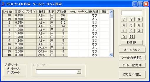 ここで、ドリルデータを出力するMPWファイルを「参照」ボタンをクリックて選択し、「出力Fレイヤー、Tレイヤーの指定」から「指定なし」を選択してください。両設定が終了したら、「OK」ボタンをクリックしてください。 - 下記の「ドリルファイル作成 ツールシーケンス設定」ウインドウが表示されます。ここでツール番号、シーケンス、出力順番の設定を行います。
