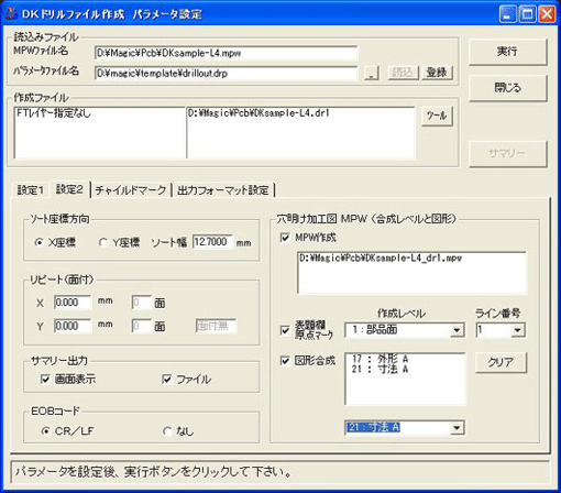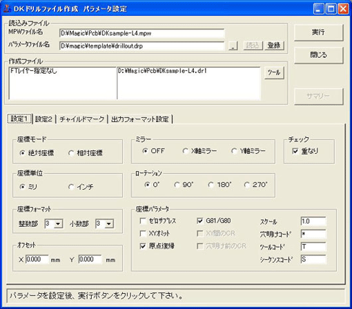 全設定が終了したら、「閉じる」ボタンをクリックしてください。 - 下記の「DKドリルファイル作成 パラメータ設定」ウインドウが表示されます。ここで、「設定1」タブの設定はデフォルトのままでOKです。
