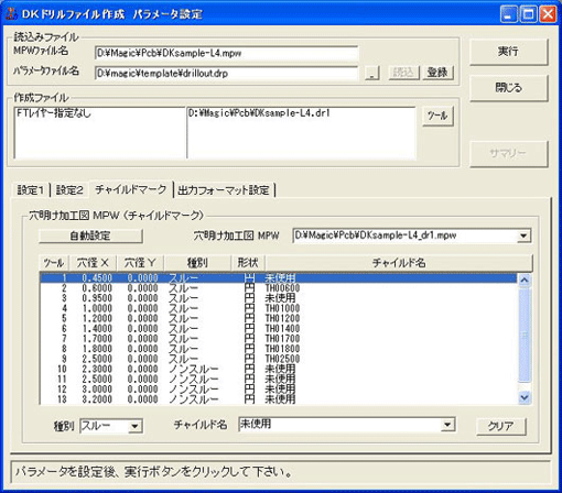 サマリーファイルはアスキーデータですのでワードパッドでの閲覧や印刷も可能です。 - 基板データがある同一フォルダ内に以下のドリルデータが出力されます。