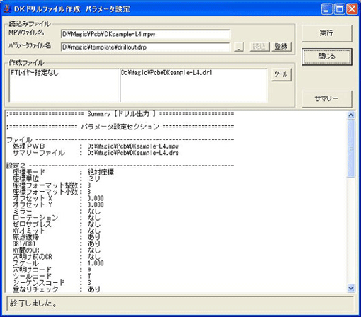 「はい」をクリックすると、ドリルデータが作成されます。 - 処理が終了すると、下記の「DKドリルファイル作成 パラメータ設定」ウインドウが表示されますので、「閉じる」をクリックしてサマリーファイル(拡張子drs)で出力結果を確認してください。