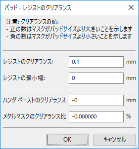 メタルマスクのサイズをレジストよりも大きくしたい場合には「ハンダペーストのクリアランス」または「メタルマスクのクリアランス比」の値を適宜指定することで変更できます。
