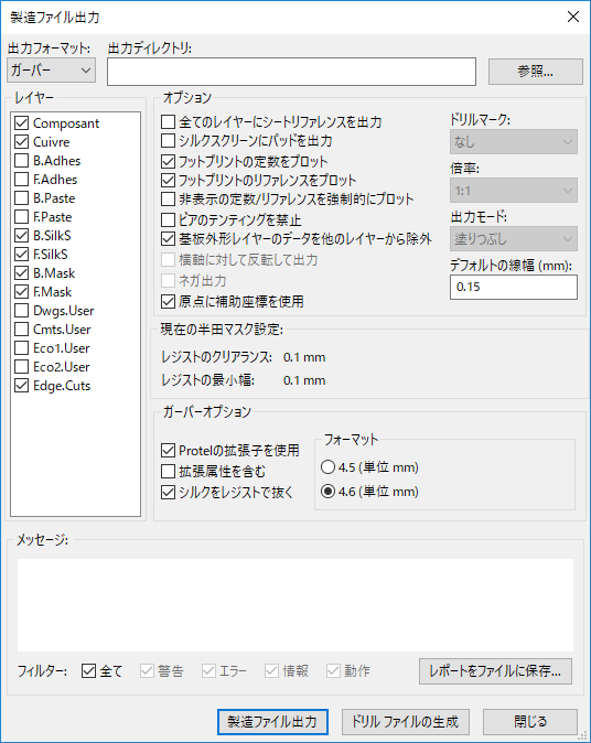 設定終了後、「製造ファイル出力」ボタンをクリックすると、ファイル名+各レイヤー名.拡張子(gtl,gbl,gts,gbrなど)というガーバーファイルが出力されます。