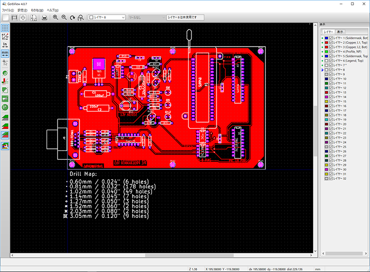 メニューより、「ファイル(F)」→「ガーバーファイルを読み込む(G)」または「EXCELLON ドリルファイルを読み込む(E)」をクリックし、読み込むファイルを選択すると、ガーバーデータ、ドリルデータが表示されます。