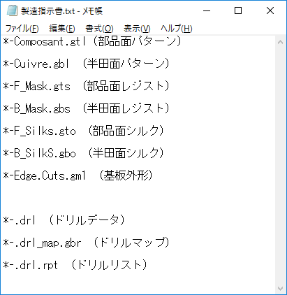 製造指示書として、以下のように各層とファイル名称をメモ(*.txt)にまとめて同一フォルダに保存します。