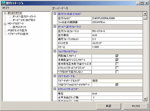 - 製作マネージャ画面のメニュー「基板データ出力/設定」を選択すると、下記のような画面が表示されます。ここで、カテゴリー「ガーバーデータ」を選択して、出力フォーマットを設定します。出力フォーマット詳細を変更する場合、フォーマットの項目をクリックするとリストが現れるので、選択し変更してください。