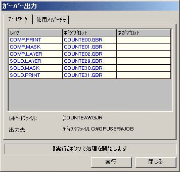 - ガーバー 出力画面でレイヤー.ファイル名、及び、保存フォルダーを確認します。「実行」ボタンをクリックすると、ガーバー出力を行います。