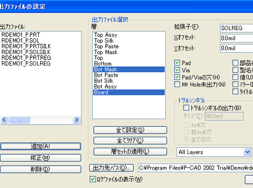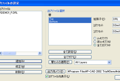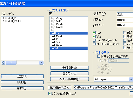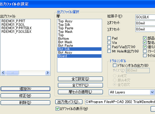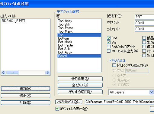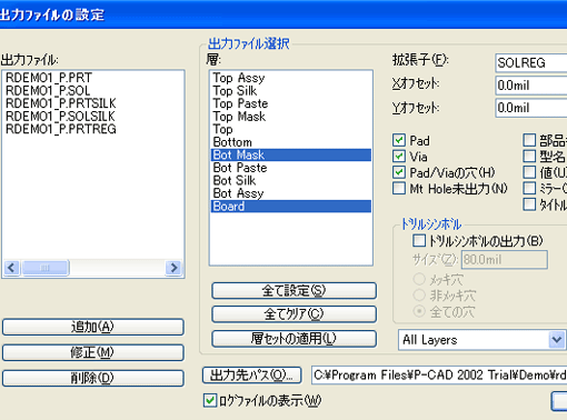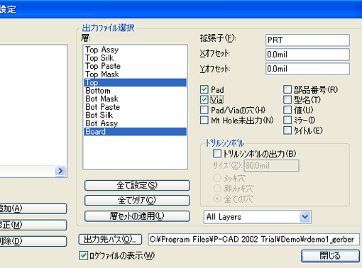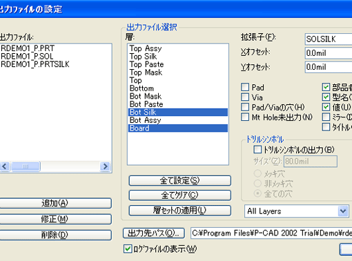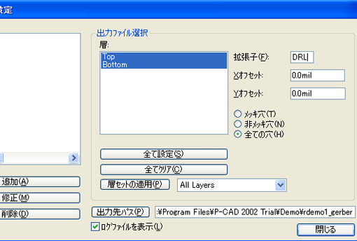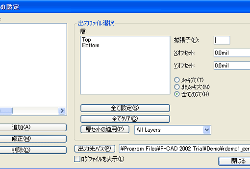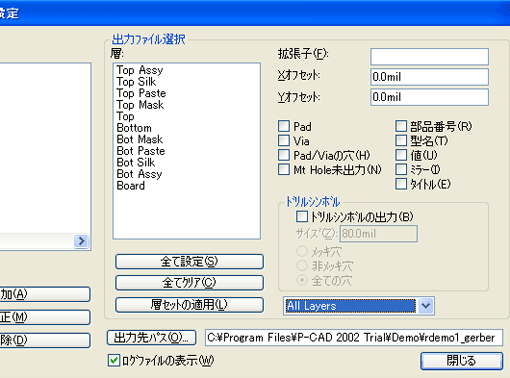 - 下記の「出力ファイルの設定」ウインドウが表示されます。「出力先パス(O)」ボタンをクリックしてデータの保存先フォルダーを選んでください。ここでは例として基板データ(Rdemo1_p.pcb)が入っているフォルダーに新しくrdemo1_gerberというフォルダーを作成して、その中に保存することにします。「層セットの適用(L)」をAll Layersにします。