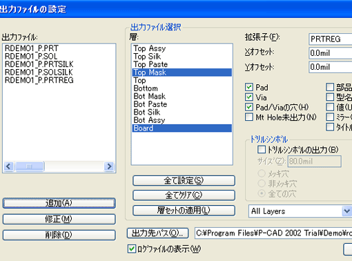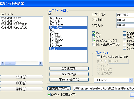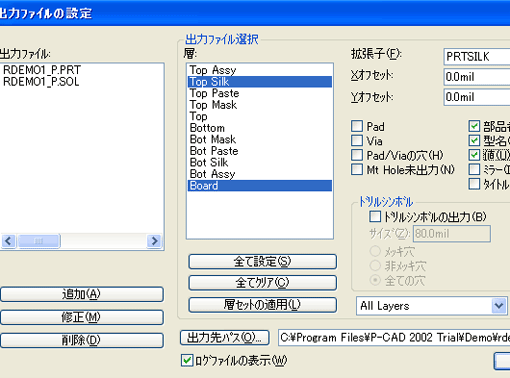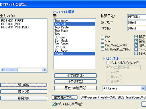 - 出力ファイルの所に、RDEMO1_P.PRTSILKというファイルが追加されることがわかります。