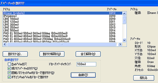 現行アパーチャのクリア(C)、回転/オフセットPadをドローで割付け(D)、ポリゴンPad/Viaをドローで割付けのチェックボックスをチェックする。 「自動(T)」 →「閉じる」ボタンをクリックしてください。 - 下記の「Gerber 出力」ウインドウに戻ります。「Gerberフォーマット(F)」ボタンをクリックしてください。
