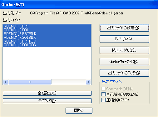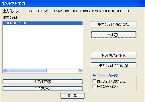 - 出力ファイルの所に、RDEMO1_P.DRLというファイルが追加されることがわかります。「閉じる」ボタンをクリックしてください。