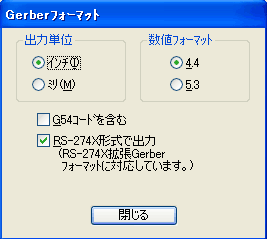 - 下記の「 Gerberフォーマット」ウインドウが表示されます。「RS-274X形式で出力」のチェックボックスをチェックしてください。