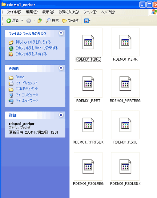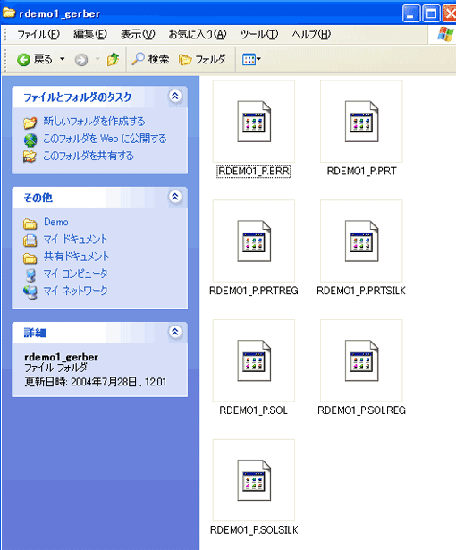 rdemo1_gerberのフォルダーの中に、下記データが出力されます。- RDEMO1_P.PRT(部品面パターンデータ)