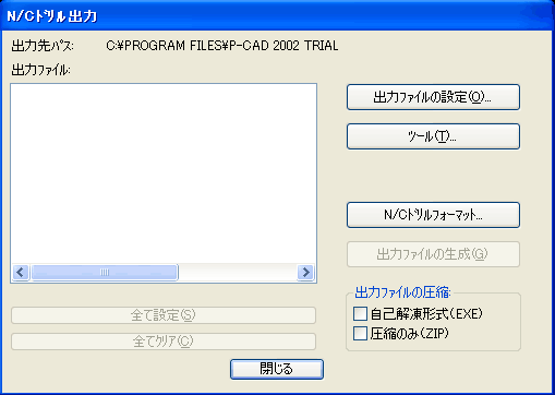 「閉じる」ボタンをクリックしてください。 - 下記の「N/Cドリル出力」ウインドウに戻ります。「出力ファイルの生成(G)」ボタンをクリックしてください。