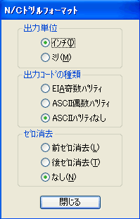 - 下記の「N/Cドリル出力」ウインドウに戻ります。「N/Cドリルフォーマット」ボタンをクリックしてください。