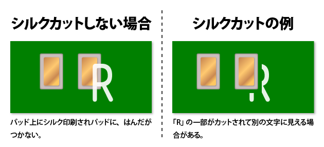 レジスト開口部のパッド上にシルク文字等が重なるように設計されたデータで、そのままシルク印刷してしまうと、部品実装時にそのパッドにははんだが付かなくなってしまいます。また、銅箔の上に直接シルク印刷されるとインクが密着せず、はがれてしまう可能性もあります。そのため製造工場では、特にお客様からの指示がない限り、レジスト開口部にかかるシルクデータを一括で削除する「シルクカット」編集をします。
