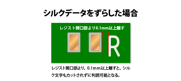 シルクデータの設計では、シルクカットされることを考慮して「レジスト開口部に対し、0.1mm以上の間隙」を確保しましょう。ロゴや極性マークなど重要な表記については、特にご注意ください。
