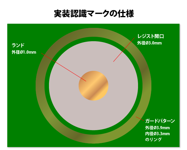 実装マークは捨て基板等によく配置されますが、マークの周りにベタ銅箔や配線がなく、Φ1.0mmのランドパターンだけでポツンと独立しているような場合、パターン形成時のエッチング液の溶解によって、一緒に溶けて無くなってしまうことがあります。この溶解から認識マークを守るため、ガード用のパターン=ガードパターンを設けます。