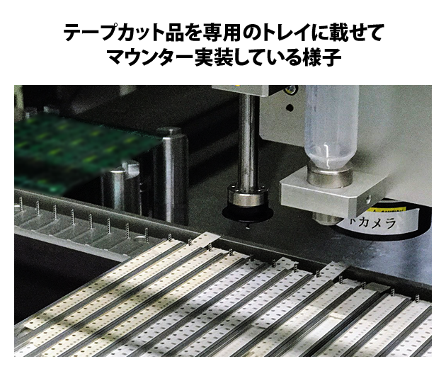 以前は「リールの余りが20cm以下」のものは「手載せ」していましたが、新型マウンター機では専用のトレイにテープカット品を載せることでマウンター実装ができます。