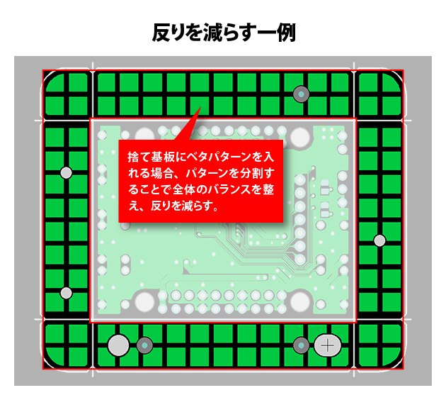 反りが起こる一因が、基材の収縮です。表面裏面のパターンの配置をバランスよくすることで、その収縮を抑えることができます。反り対策の一例として、基板全体の表裏のパターンの配置や銅箔面積(残銅率)をバランスよく設計することが前提ですが、捨て基板にもパターンを入れることで全体のバランスを整え、反りを減らす効果があります。