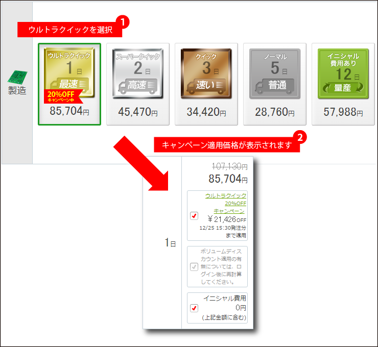 ※板材や板厚等の仕様、製造枚数によってウルトラクイックコースが適用されない場合がございます。