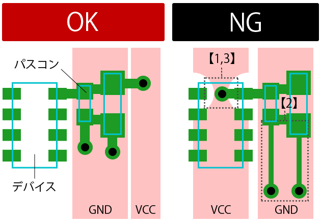 【1】電源配線(VCC)からデバイスの電源ピンへの配線は、パスコン(※バイバスコンデンサの略)を経由して接続しましょう。パスコンを経由することで、電源が安定します。
