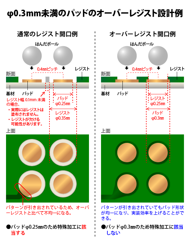 0.4mmピッチのBGA部品では、パッド径に対してレジスト開口径を小さくする「オーバーレジスト」を推奨します。
