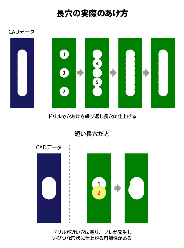 短い長穴の場合、ドリルが2発目を進入する際に1発目の穴に寄り、傾きが発生してドリル角度が変わり、いびつな形状に仕上がる可能性があります。