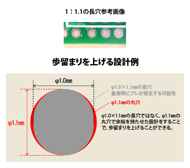 そのため、少なくとも長穴の比率は1:2以上を推奨しています。Φ1.0x1.1mmの場合、1:1.1となり、参考画像として下の写真のような長穴になる可能性があります。