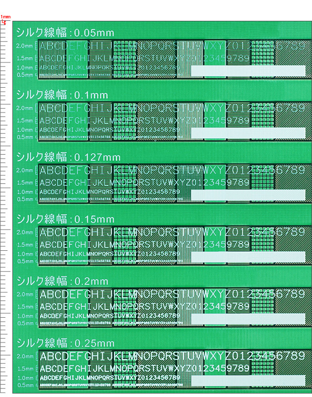 最小値未満でも可読できる文字は存在しますが、印刷文字やパターンの影響で可読性が変わることが見て取れます。なお、実基板サイズで確認したい方は、寸法を参照の上で印刷してご確認ください。