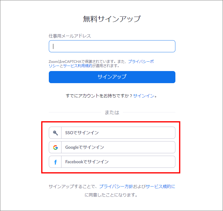 「SSO」「Google」「Facebook」のアカウントをお持ちの場合は、サインアップ(アカウント作成)不用でサインインできます。