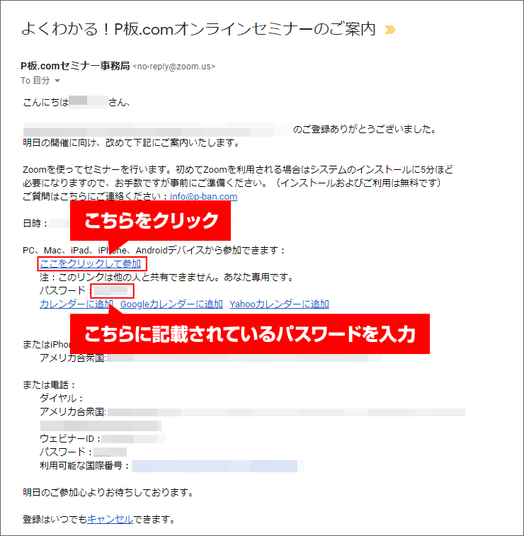 セミナー開催前に「セミナーのご案内」メールが配信されます。メールを開封し、記載されている「ここをクリックして参加」をクリック、パスワード入力画面にてパスワードを入力後セミナーへ参加となります。