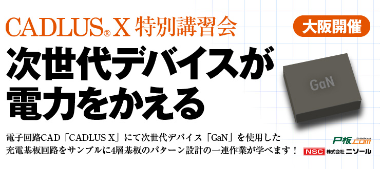 電子回路CAD「CADLUS X」にて次世代デバイス「GaN」を使用した充電基板回路をサンプルに4層基板のパターン設計の一連作業を学んでいただけます。