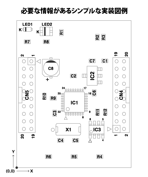 白黒印刷出力でもしっかり可読することができ、配置番号、部品の形状、極性指示、ピン番号、コネクタの向きなどの必要な情報が見やすく分かりやすいシンプルな実装図サンプルです。