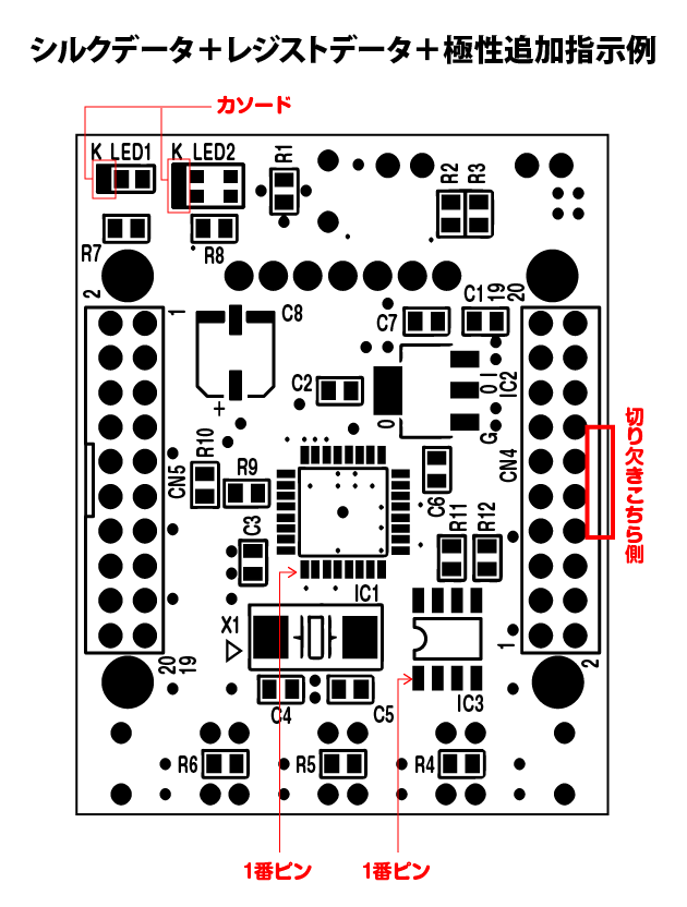 その場合は、「配置番号」、「部品の形状」、「部品の向き(極性、ピン番号)」が、しっかり分かるように、シルクデータの設計、または実装図への手書きでの指示が必要となります。