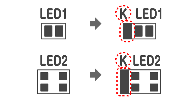 シルク枠を他よりも太枠で表記し、K(カソード)マーク、A(アノード)マークを追加する方法もございます。