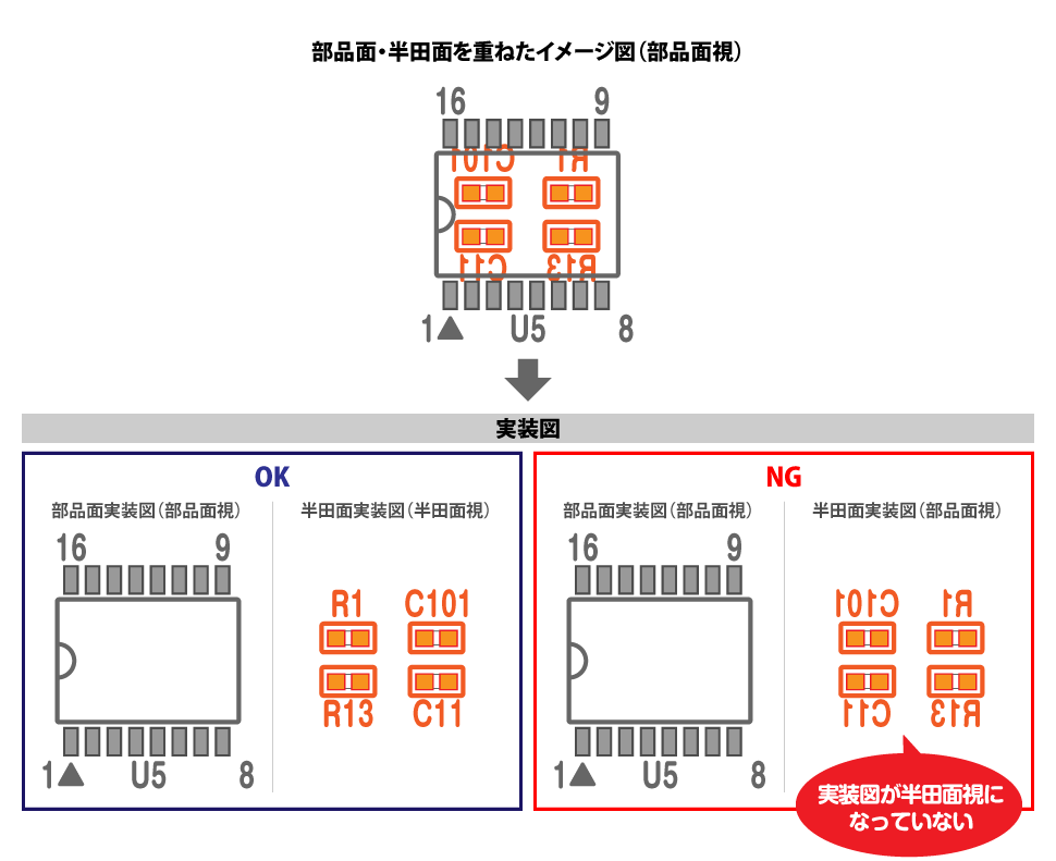 また、半田面に実装する部品実装図は【半田面視】で図面の作成をお願いいたします。