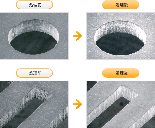 レーザー加工メタルマスクの開口壁面の凹凸を平滑にするための処理です。この加工を施すことにより、従来のメタルマスクよりさらにクリームはんだの抜け性が良くなり、版のニジミも低減されて印刷性が向上します(追加費用5,000円)。
