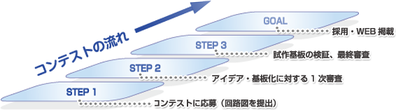選考は回路図の審査による1次審査と、応募者の協力のもとに実際に基板化した回路の動作を評価する最終審査の2段階審査となります。