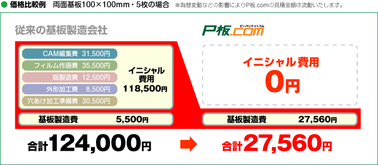 P板.com基板製造サービスでは、プリント基板を調達する際の最大のネックである 「製造イニシャル費用(フィルム、シルク版、CAM編集費、その他)」を全て無料にしました。 1枚でも5枚でも、必要な枚数の基板をどこよりも安く調達できます。