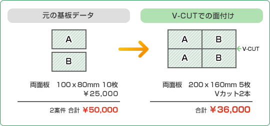 P板.com基板製造サービスでは、データを面付けできる編集サービスを行っております。 複数案件ある場合は、面付けして1案件にされた方が断然お得です!